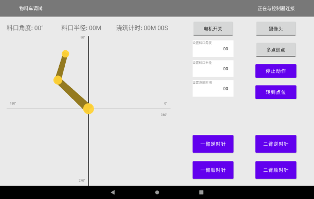• 借助APP可實時監(jiān)測各臂架回轉(zhuǎn)角度、澆筑半徑、巡點進度、電磁閥狀態(tài)及系統(tǒng)報警信息,并實時查看出料口視頻影像,全程可視、可控。
