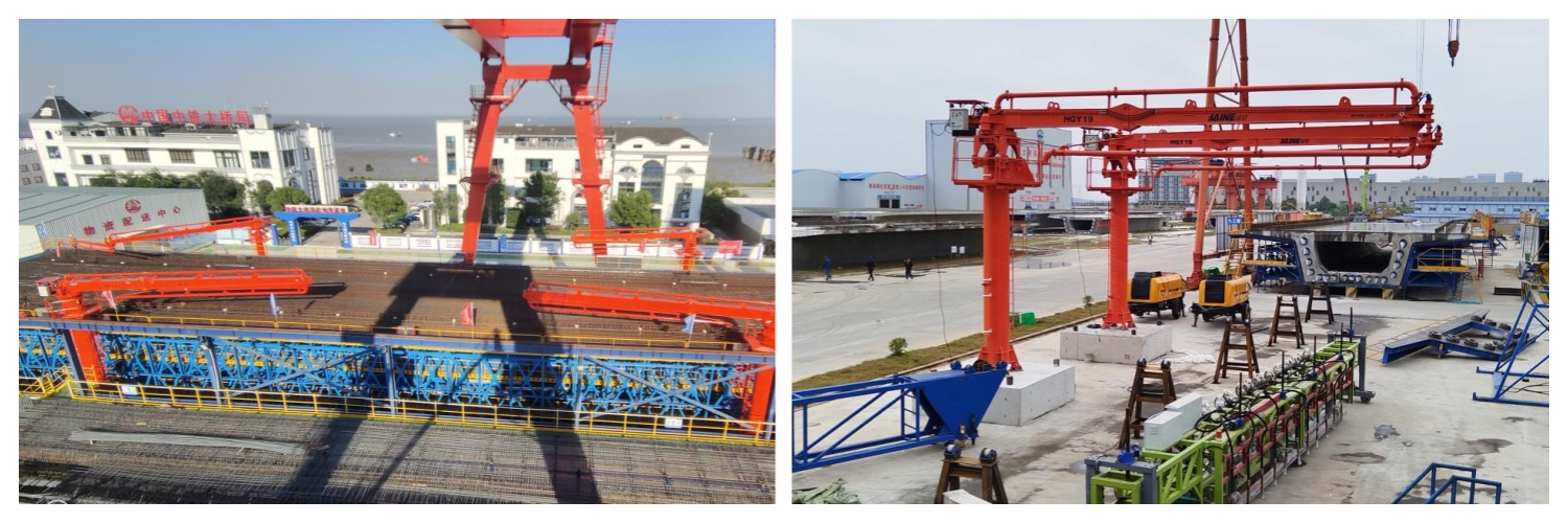 “建研”智能布料機已廣泛應用于橋梁建設(shè)的多個關(guān)鍵環(huán)節(jié),包括錨碇、承臺、預制箱梁、橋面及橋塔等部位的混凝土澆筑。