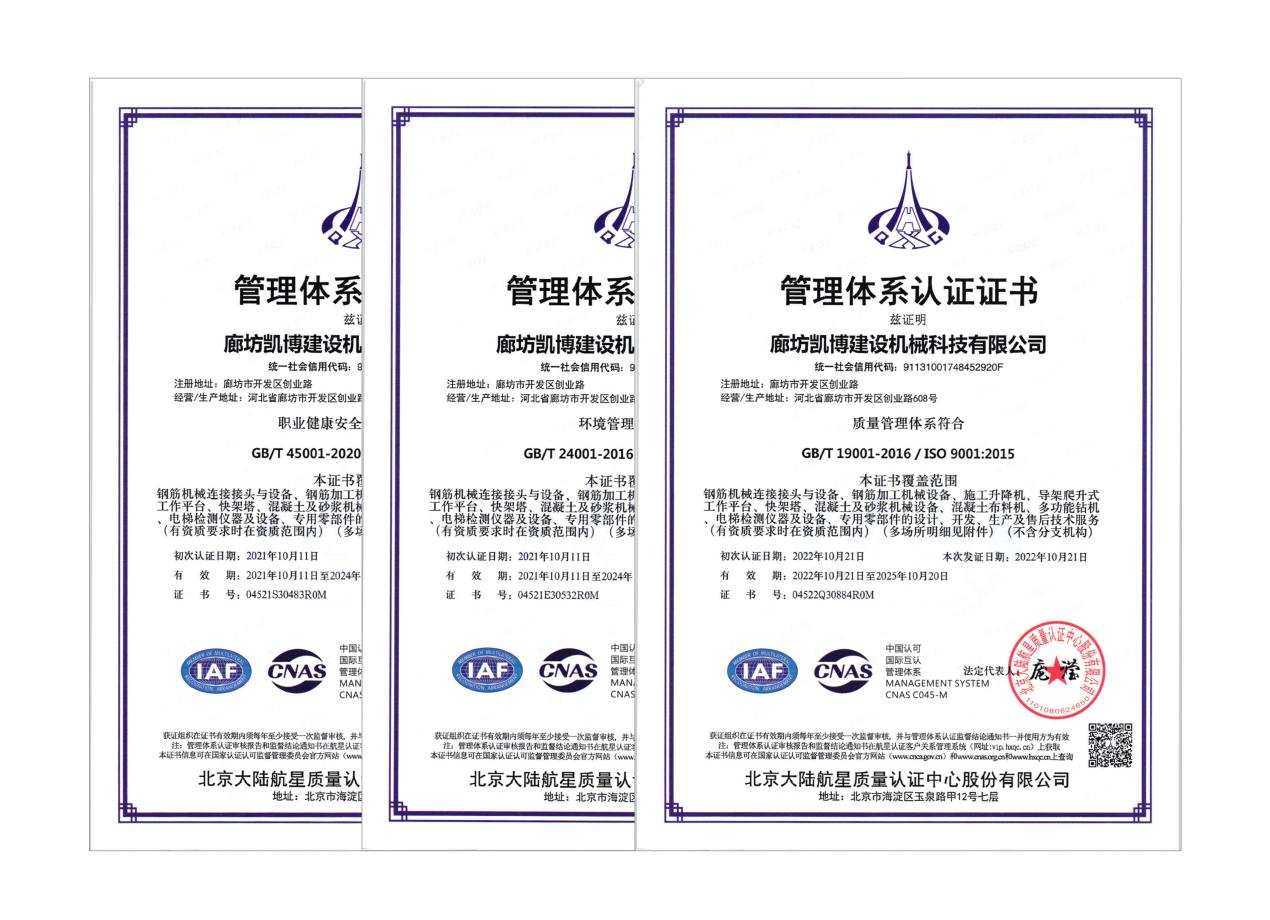 2022年9月26日至30日,北京大陸航星質(zhì)量認證中心股份有限公司對廊坊凱博建設機械科技有限公司開展了為期5天的質(zhì)量、環(huán)境、職業(yè)健康安全管理體系外審工作,在公司領導的高度重視和各職能部門的積極配合下,外審工作順利完成。