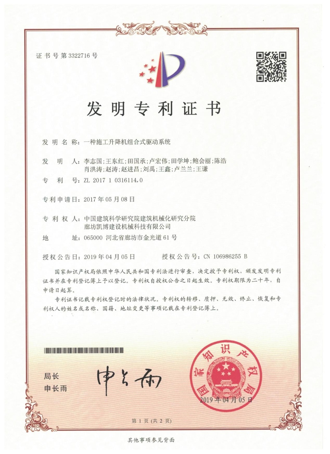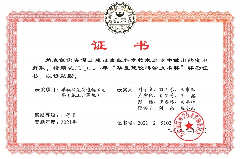 ? ? ? ? ? 本產(chǎn)品獲2項(xiàng)發(fā)明專(zhuān)利——施工升降機(jī)組合式驅(qū)動(dòng)系統(tǒng)(專(zhuān)利編號(hào):ZL201710316114.0)和手動(dòng)離合增力矩裝置(專(zhuān)利編號(hào):ZL201610933946.2);主編參編GB/T37537-2019《施工升降機(jī)安全監(jiān)控系統(tǒng)》、GB/T 26557《吊籠有垂直導(dǎo)向的人貨兩用施工升降機(jī)》兩項(xiàng)國(guó)家標(biāo)準(zhǔn);2021年榮獲“華夏建設(shè)科學(xué)技術(shù)獎(jiǎng)”二等獎(jiǎng)。為解決我國(guó)超高層建筑人員物料垂直運(yùn)輸?shù)母咝О踩椒€(wěn)運(yùn)行難題提供了強(qiáng)有力的技術(shù)支撐。